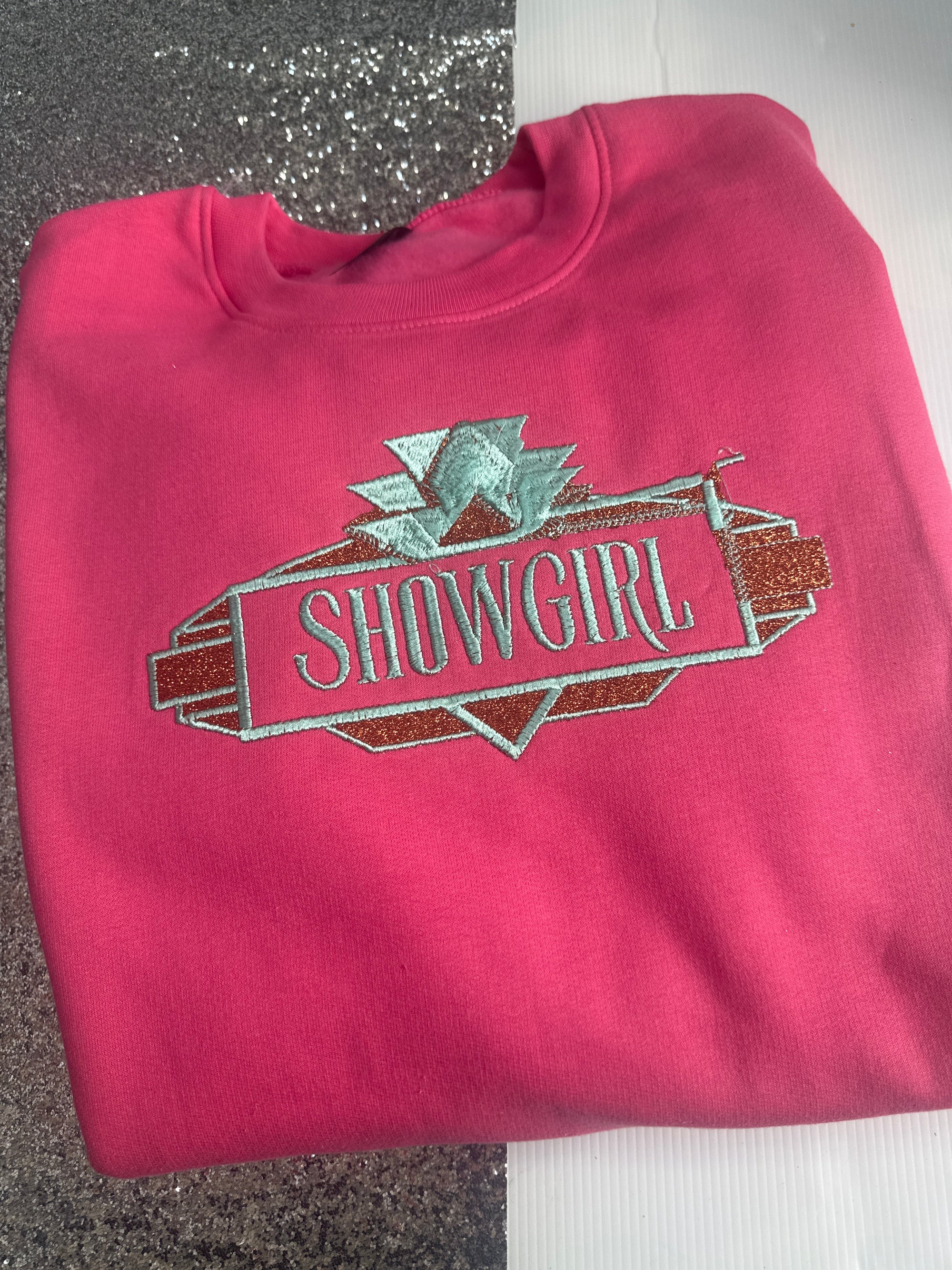 Medium (10/12) hot pink showgirl appliqué glitter sweater